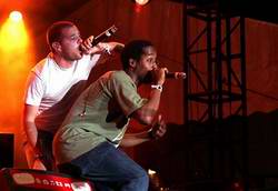 Das Lamentieren und Frieren soll irgendwann ein Ende haben, es ist soweit, wir sehen tatsächlich Musik. Musik und feiern, die zentralen Fixpunkte diese zwei Tage, denn wie wichtig den Machern das ist, daran lassen ein Partyzelt inkl. Strandathmosphäre, ein Indieclub, zwei Bühnen, und in all das eingebettet, die offene Zeltstage, keine Zweifel aufkommen. Eben diese Gemini Stage betrete ich dann auch zuerst, um von einem Highlight gleich in den Arm genommen zu werden: Mediengruppe Telekommander liefern veritabel ab, und leisten nebenher einen wichtigen Dienst: diese leicht irre Geilheit ihr Elektropunks hat sich noch nicht überall rumgesprochen, und in diesen tempelgleichen Stahlkulissen lässt es sich wunderbar missionieren. Der Abend ist schon fortgeschritten und das Zelt daher gut gefüllt, obwohl mit Phoenix eine weitere Band, die es versteht über ihren musikalischen Tellerrand zu blicken, gegenüber, aber quasi unüberwindbar von einem dieser riesigen Stahlkolosse getrennt auf der Medusa Mainstage direkt gegen unsere zwei elektronischen Freunde anspielt. Der weitere Ablauf scheint klar; an den Pet Shop Boys führt kaum ein Weg vorbei. Wie man etwa auch Madonna, die dieses Jahr mit ihrem Festivalauftritt auf dem Coachella absolutes Neuland betritt, eben wenn sich die Möglichkeit denn tatsächlich bietet, zumindest mal kurz reingeschaut haben sollte, verhält es sich auch mit den zwei gesetzten Herren, die die Diskopop per definition in die Welt getragen haben. Nicht mehr zu den jüngsten zu gehören ist wohl für Tennant und Lowe nie ein Problem gewesen, zumindest nicht was ihre Bühnenperformance betreffen sollte; der eine gibt den Gentleman und stolziert etwas über die Bühne, der andere steht unverändert seit über zwanzig Jahren hinter seinem Keyboard. Selbstreden lässt man sich da auch 2006 noch etwas einfallen, denn im Gegensatz zur minimalistischen Release Tour gibt man sich nun wieder völlig pet shop. Besonders die riesigen weißen Stoffaufbauten, von innen beleuchtet und verschiedenartig kombinier- wie bewegbar, machen die Show, in der verlässlich nahezu alle Hits auf dem Silbertablett präsentiert werden, noch ein kleines bisschen grösser. Mit überraschend wenigen aktuellen Songs beendet das Duo also eine für Fans wohl schon etwas zu lang anhaltende Phase; denn wie Tennant bemerkt: "so we're now no german festival virgins anymore!". Visuell ähnlich beeindruckend punkten Deichkind dann im frühen Morgen mit einem Auftritt, den niemand, der Raab's Bundesvision Song Contest gesehen hat, überraschen dürfte; alle andern aber eben doch. Und das im grossen Stil, denn euphorischen könnte der erste Tag kaum ausklingen, dafür sorgt die abschliessende Stage Invasion (kann man sehen: YouTube hilft gerne weiter mit eben diesen Stichwörtern), dafür sorgen die abgefreakten Outfits (Pyramidenköpfe, Feuerregen überall, weisse Tiger etc.), dafür sorgen Bo's berherzter Auftritt und auch alte Hits, die vergessen nicht sind. Dazwischen: Hell. Turntablerocker alter Schule weiss er genau was viele Menschen die auch wegen ihm gekommen sind, hören wollen. Wieder gilt: manche wissen eben, wie man das macht. Und wo wird es schwierig: im Meltklub - der ist nämlich notorisch überfüllt, denn richtig viele passen in die kleine Halle leider nicht rein, sodass sich bei Acts wie den Sternen etwa die Massen am Eingang stauen. So und nicht anders sollte sich das bei Kante, Peterlicht oder Schneider TM wiederholen.